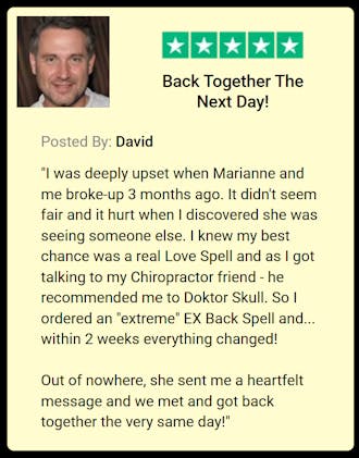 “I used to lie awake at night, staring at my phone, wondering if I should text and what I could say. Then I found the Dok's website online, and straight-away clicked so he cast his EX Back Spell - straightaway it felt like pure warmth streaming into my heart. The very next morning, my Ex called, and we spent hours reconnecting and we've been together ever since!”
